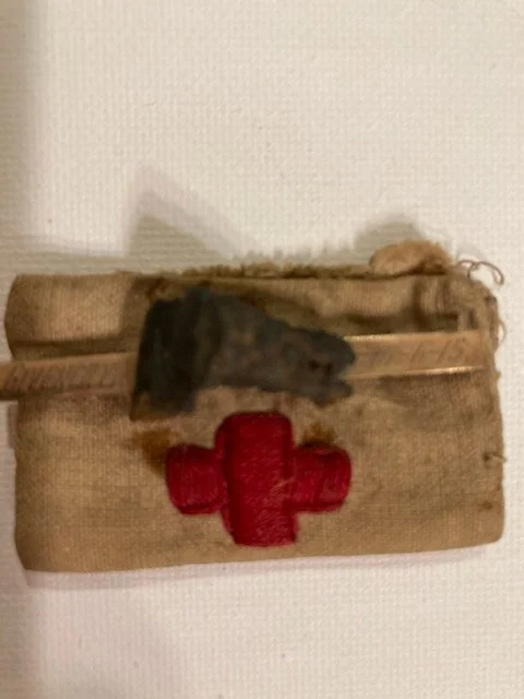 He was taken to the 1st Canadian Field Ambulance, then on to #10 Casualty Clearing Station and then transferred to 13th General Hospital in Boulogne for surgery to remove the shrapnel. This hospital treated casualties with injuries to the eye, jaw, and face. He was able to keep that piece of shrapnel as a souvenir! (The bar along the pin shows “Givenchy 16/6/15”, the date it lodged in his head. See photo below.)