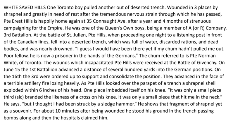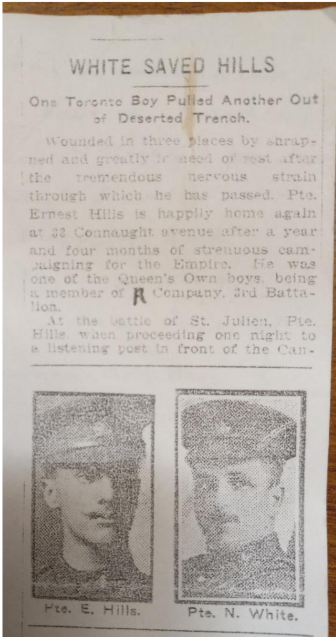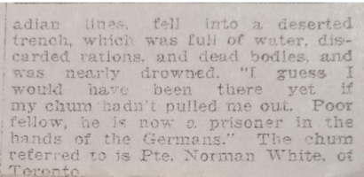 While serving with the 3rd Battalion he was active at the Battle of St. Julien and the Battle of Givenchy in Belgium near Ypres. This was at the time that the Germans first employed chlorine gas as a weapon. During the first battle in April 1915, he was out at night on a reconnaissance mission when he fell into a water-filled deserted trench and would have drowned if not pulled out by a fellow soldier, Pte. Norman White, a fellow Torontonian. (Details are in the newspaper clip below.)