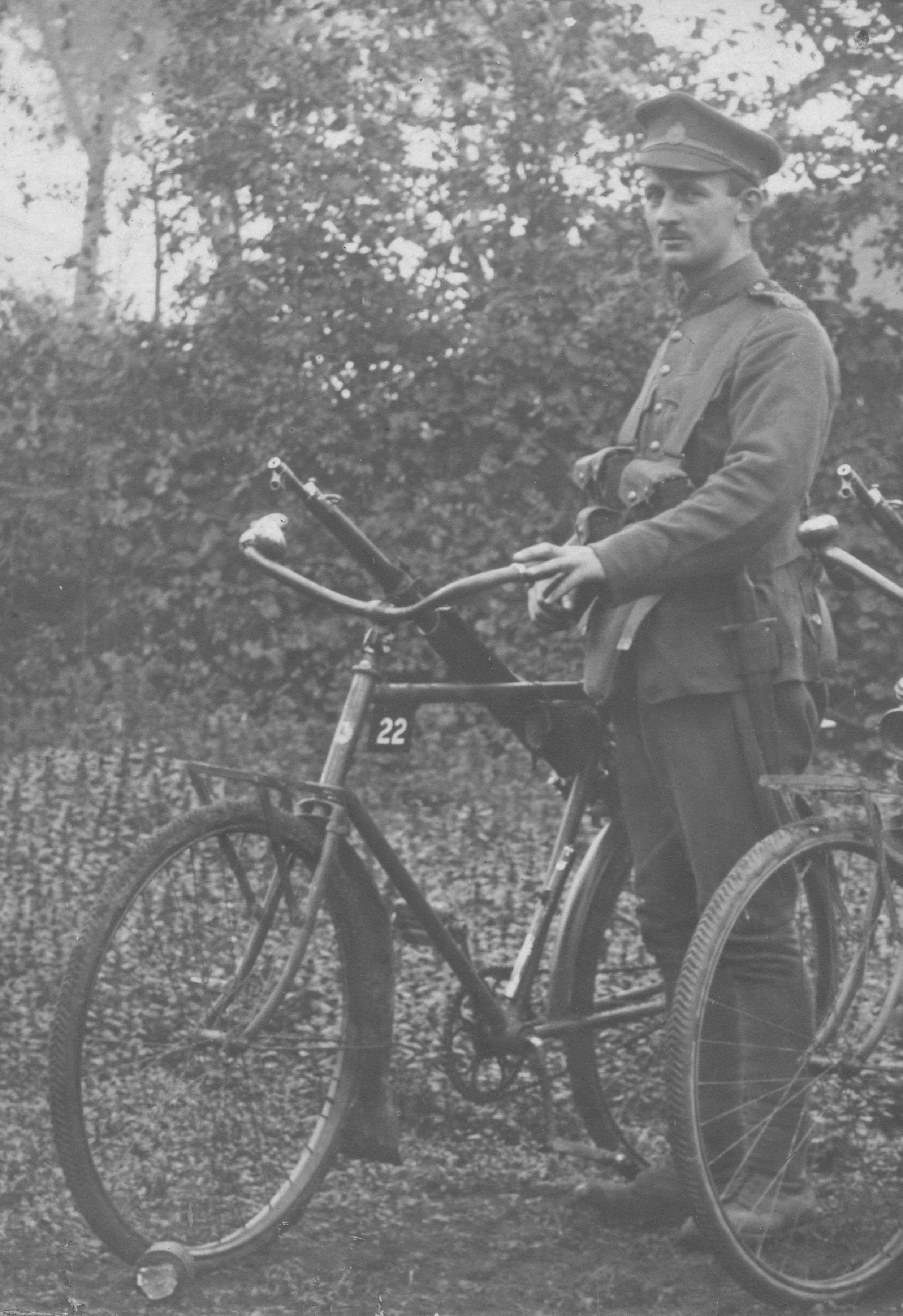 Earle was a member of the Second Division, Cyclist Corps – he and his comrades were bicycle “pedal pushers,” not motorcycle riders. It may seem a little quaint today, but in World War 1 bicycle-mounted infantry, scouts, messengers and ambulance carriers were extensively used by all combatants; indeed, among the Canadian troops were five divisions of cyclist corps. Bicycles were found to be invaluable for reconnaissance and communications work, being lighter, quieter, and logistically much easier to support than horses. To some extent, bicyclists took over the functions of dragoons, substituting for horses in warfare and in the quick transport of men and supplies. Cyclists also acted as battalion runners and dispatchers, as well as soldiers who took part in direct combat.